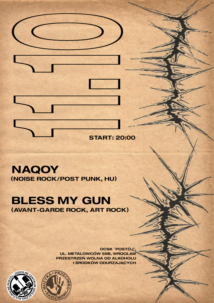 Hałasy, sztuka, hałasy, sztuka, hałasy, sztuka – tak szykuje się piątkowy wieczór 11 października na postoju. A to dzięki projektowi NAQOY z Budapesztu który odwiedza by zaczarować trochę post rockową, i post punkową magią. A w takiej magii mamy we Wrocławiu specjalistę który zagra z nimi tego wieczoru czyli Bless My Gun – który łączy refleksyjną, kontestującą lirykę z psychodelicznymi i eksperymentalnymi brzmieniami.